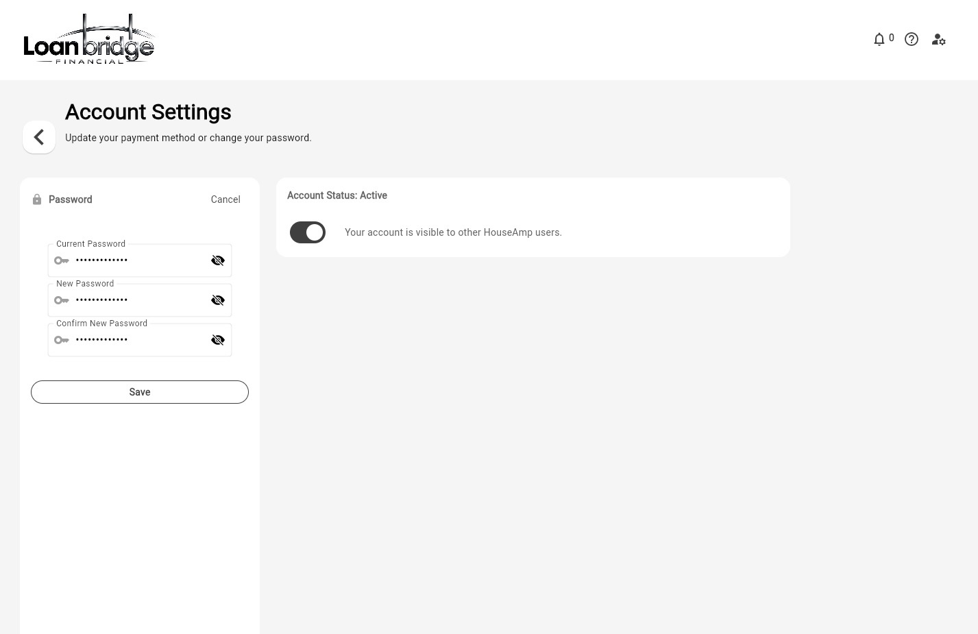 The Account Status toggle controls whether your account is visible to other HouseAmp users within the platform.