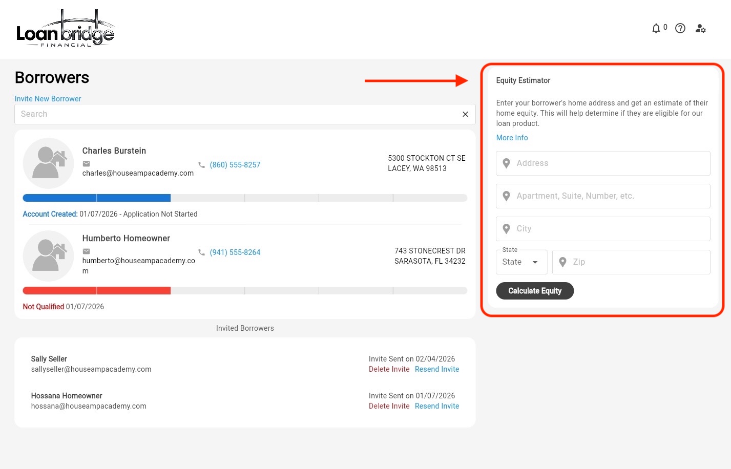 The Equity Estimator is located on the right side of your Borrowers dashboard.